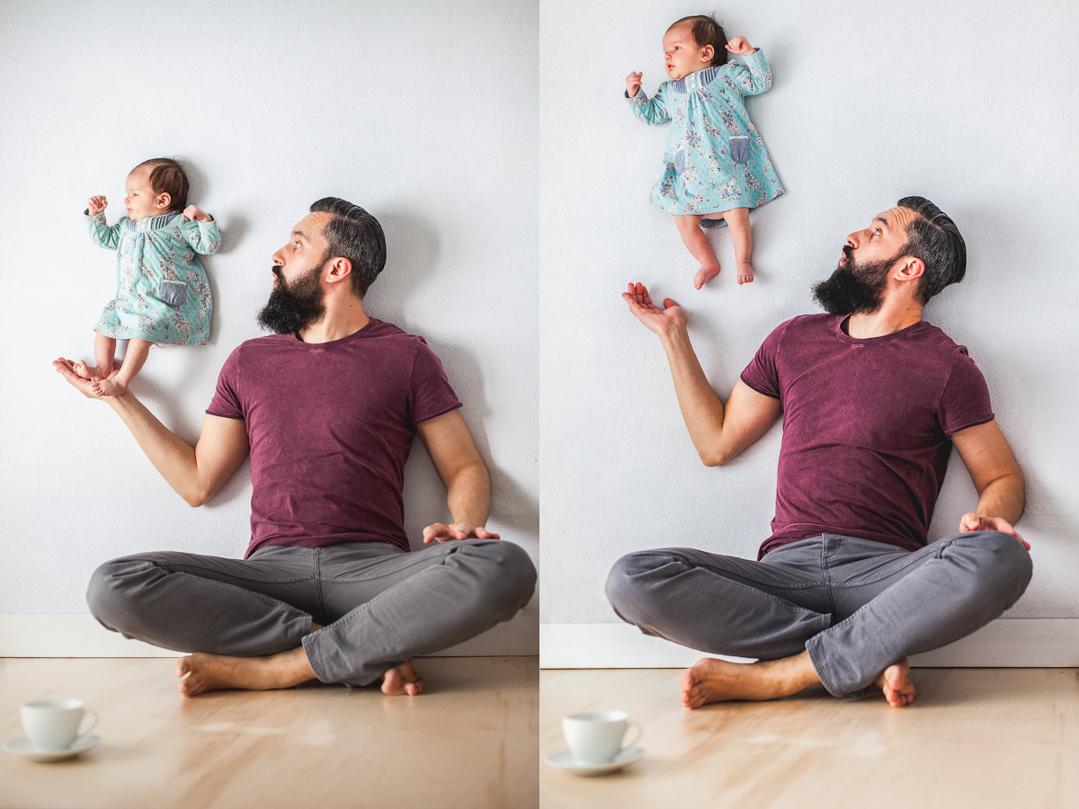 那么他们是怎么做到的呢?其实很简单,就是利用制高点,宝宝和爸爸躺在白色的床垫上,然后妈妈从高处进行拍摄。一个有趣的创意,一个简单的场景,没有多余的道具,不但保证了宝宝的安全,还增加了一家人在一起的时间与回忆。Ania Waluda和Michal Zawer希望通过这组作品来证明,即使是一个很小的场景也能拍出有趣的作品,最重要的是宝宝还超级安全,对父母来说,这才是至关重要的。